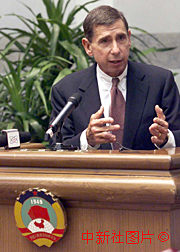 美國前商務部長坎特16日在北京舉行的“21世紀論壇”2000年會議午餐會上演講時指出:中美確實需要加強多層次的合作。中新社記者:李剛 攝