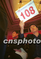 “中央電視臺2002年黃金段位廣告招標會”于11月8日在北京梅地亞賓館舉行。會議由著名電視節目主持人白巖松、王小丫主持。中央電視臺黃金時段廣告僅10幾分鐘,去年招標額達26億,占全國廣告份額的6%。每次招標都采用多標方式,有明標也有暗標,有的標是從高往低叫,有的是由低往高叫,整個招標過程緊張、激烈。圖為來賓正在舉牌投標。中新社圖 劉咪 攝