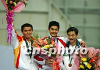 圖:邢傲偉獲得男子自由體操冠軍 2001年11月18日 22:13 ![]() 奧運明星邢傲偉十八日在九運會男子自由體操比賽中獲得冠軍,盧裕富、楊威分別獲得第二、三名。中新社記者 張宇 攝 |