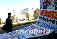 圖:人民幣利率今起下調 2002年02月21日 13:14 ![]() 一位市民二十一日經過中國人民銀行北京總部前的一個報攤。為了克服世界經濟增長持續放緩對中國經濟發展帶來的不利影響,保持中國國民經濟持續、快速、健康發展,中國人民銀行今起再次下調人民幣存、貸款利率。中新社圖 武仲林 攝