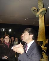 三星堆青銅器亮相紐約大都會博物館(多圖) 2002年03月06日 10:06 ![]() 鑲有金箔的青銅頭像是四川三星堆出土、公元前十三世紀的珍貴文物。 ![]() 紐約大都會博物館亞洲部副主任孫志新博士,向人們解說首次在美國亮相的中國四川三星堆青銅器的特點。 中新社紐約三月四日電(記者 陳建)天藍色的廣告旗幟今天懸掛在紐約大都會博物館正門外,告訴人們展現中國古蜀文化的珍寶將于三月六日至六月十六日在這里展出。這些展品中最令人驚嘆的,莫過于從四川三星堆出土、約三千年前的青銅器。 走進一樓展廳,最先看到的是一尊寬一米三八、高六十六厘米的U型青銅面具。沒有溫柔的背景光源,只有幾束強光從不同角度打在線條粗獷的面具上,留下明顯的陰影。面具形象與傳統的中國人差異很大——粗眉、大眼、高鼻、闊嘴,眼珠的位置上還釘著楔子!面具后,是一面高大的黑色背景板,上面用淺灰色的字寫著:“寶藏源自一個消失的文明”。 這就是從四川中部三星堆遺址中出土的青銅器,鑄造年代大約是公元前十三世紀,比中原地區的青銅器普遍早幾百年。那時,地球上的絕大部分地區還處于蠻荒時代。迄今,全世界的專家都弄不清楚,三星堆青銅器高超的冶煉技術是從哪兒來的?古蜀國是怎么產生、持續多久、為什么又突然消亡了? 不過,古蜀文明雖然看上去有暴戾、兇悍和屬于靈鬼的一面,但展品中,人們也能找到許多纖美、甚至世俗的特征。一棵青銅鑄造、攀龍附鳳、綴滿銅錢的“發財樹”就精美得幾近繁瑣。另外一尊全高兩米六、細細長長的青銅人像,雖然也是粗眉、大眼、高鼻、闊嘴、兩支大耳朵上明顯地穿了能帶耳環的“耳洞”,但面目祥和許多,眼睛上也沒釘楔子。 據說,那尊青銅人像是世界上現存最高的青銅像。銅像兩手一高一低,好像握著什么東西。專家推測,因為太細太高,銅像站在那里,如果手中再稍有負重,肯定會摔倒。 本次四川古代藝術展共有一百二十八件文物,除青銅器外,還有玉雕、石雕等。 據紐約大都會博物館亞洲部副主任孫志新博士介紹,本次展覽是近年來唯一一次展示四川一個地方從公元前十三世紀到公元三世紀約一千五百年間的文化源流與演變,對于向世人集中介紹中國文化的起源、中國古代文明的形象具有非常重要的意義。 據悉,在紐約展完后,這些珍貴文物還將到多倫多展出四個月。