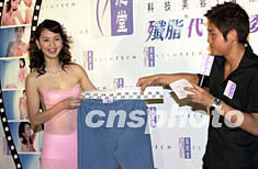 ![]() 影視紅星洪欣14日在香港出席「減肥堂」殲脂代言人記者會。大會特別安排別開生面的「身寬舊褲大比拼」,將代言人洪欣殲脂前的長褲尺碼展示。中新社圖 鄧慶樂 攝