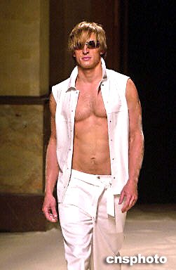多圖:性感模特巴黎展示2003春夏男裝 2002年07月02日 16:41 ![]() 2002年7月1日,2003巴黎春夏男裝展上模特展示法國設計師設計的白色褲子和無袖襯衫。