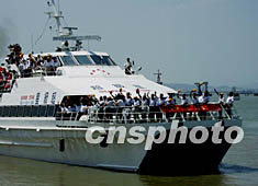 ![]() 七月二十五日下午,乘載泉州天后宮媽祖金身的臺灣“超級星”號客輪駛離泉州后渚港,直航返回澎湖。作者:華小銳