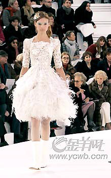 該品牌的高級定制服,向來就偏重經典的傳統風格,掌門人KarlLagerfeld沿襲了香奈兒女士穿著設計的靈感,白色平底靴,斜呢紋套裝還有白色透明褶皺硬紗翻領,皆有可尋。