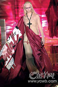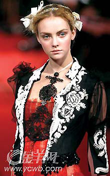 場地內鋪天蓋地的紅色光影,眼眶涂抹厚重陰影,表情冰冷僵硬如同雕像的模特,身著鮮紅塔夫綢長裙,發布會伊始就彌漫著宗教與政治相互交織的濃烈味道。一名模特兒的頸上,還繪上了法國大革命發生的年代———“1789”刺青圖案。繁復綴飾的馬甲、抓皺的波紋和高腰典雅的長禮服,怵目驚心之下卻深刻地展現出風華年代的衰敗感。就連最后謝幕時,JohnGalliano也以華麗的舞劍串場,來結束此季演出,精采十足。