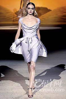 ChristianLacroix的時裝以設計復雜多變、風格瑰麗多彩見稱,他在這一季的高級定制女裝展中,最搶眼的是一襲如夢似幻的象牙色的雪紡紗短裙,紗裙上有精致的刺繡花朵,不論是用料和細節處理都極為細致,美麗得令人屏息。“金”是最能閃耀奢華的色調,更被ChristianLacroix于今季帶有濃郁宮廷色彩的系列中大量運用:鑲滿珠寶鉆飾的包款鞋,層疊在衣領、袖口或是裙擺的蕾絲荷葉邊,當然還有各式各樣富麗貴氣的頭飾。配合瑰麗的設計風格,充分表現出法國式的艷麗。