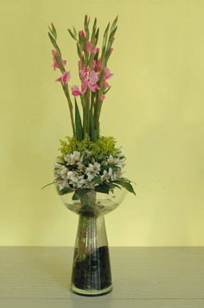 花材:劍蘭、水仙百合、黃鶯、八角金盤(pán)、燈臺(tái)