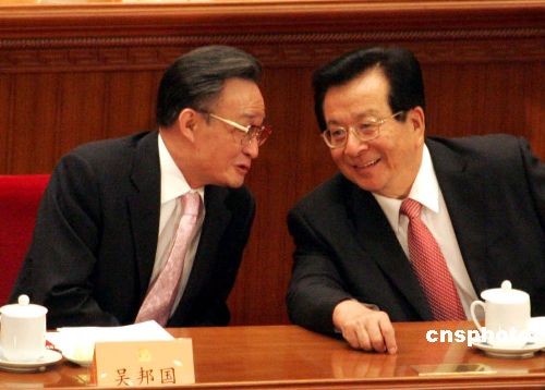 三月十四日上午,全國政協十一屆一次會議在北京人民大會堂閉幕,吳邦國(左)與曾慶紅出席會議,并在主席臺上交談。中新社發 潘索菲 攝