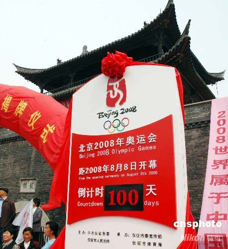 4月30日上午,江蘇儀征市數千市民集聚在該市中心鼓樓廣場,參加儀征市迎奧運倒計時100天揭牌慶典儀式。 中新社發 儀征周曉明 攝