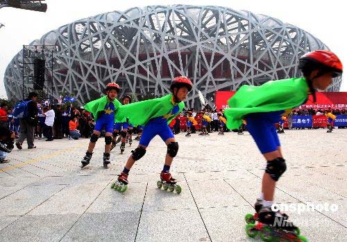 北京奧運會倒計時100天群眾馬拉松接力活動暨2008年北京國際長跑節,4月30日上午在北京國家體育場公共區隆重舉行,活動中馬拉松接力賽、群眾建身長跑、群眾體育展示等內容豐富多彩、氣氛活躍祥和。此項活動由國家體育總局、中國奧委會、北京市政府、第29屆奧林匹克運動會組委會主辦。中新社發 宋吉河 攝