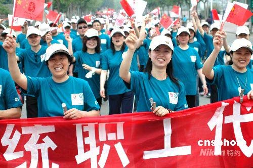 4月30日,安徽省蕪湖市舉行聲勢浩大的企業職工歡慶奧運倒計時100天健身行喜迎“五一”國際勞動節活動,數千人參與游行隊伍行列。中新社發 陳立希 攝