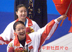 中國女子跳水選手伏明霞、郭晶晶二十八日在悉尼奧運會三米跳板比賽中分別獲得金牌和銀牌后,揮舞五星紅旗向觀眾致意。中新社傳真 李剛 攝