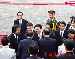 朱镕基總理與出席歡迎儀式的日方官員握手