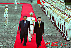 日本首相森喜朗13日上午為昨晚抵日開始正式訪問的中國總理朱镕基總理舉行隆重歡迎儀式。圖為森喜朗陪同朱镕基檢閱儀仗隊。作者:劉敬師