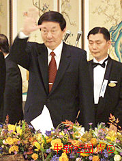 中國總理朱镕基18日在韓國經濟四團體舉行的午餐會上向韓國經濟界的來賓揮手致意。中新社記者 王曉暉 攝