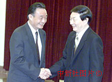 中國國務院總理朱镕基訪問日本、韓國后,22日乘專機回到北京,國務院副總理吳邦國等在北京人民大會堂迎接。中新社記者 毛建軍 攝
