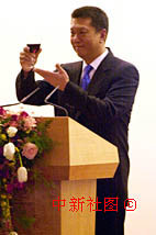中華人民共和國澳門特別行政區成立一周年慶祝晚宴十九日在澳門綜藝館舉行,行政長官何厚鏵在宴會上致辭并祝酒。中新社傳真 宗金柱 攝