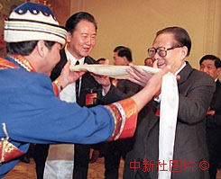 國家主席江澤民十三日到全國人大甘肅省代表團參加討論時,接受少數(shù)民族獻上的哈達。作者:宗金柱