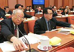 全國人大香港代表吳康民(前左一)在十四日舉行的九屆全國人大三次會議主席團第三次會議上按表決器。作者:李剛