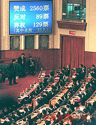 九屆全國人大三次會議十五日舉行閉幕會,以二千五百六十票贊成、八十九票反對、一百二十九票棄權通過了中華人民共和國立法法草案。該法案從今年七月一日起施行。作者:王麗南