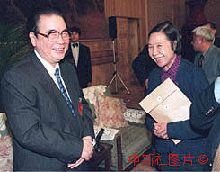 李鵬參加小組討論時(shí)和著名兒科專家胡亞美交談 2000年3月6日 08:45 ![]()
