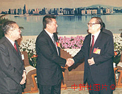 江澤民與澳門特區行政長官何厚鏵握手交談 2000年3月9日 08:49 ![]()