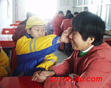 元宵節來北京勞教所看望母親的孩子,給曾是法輪功練習者的媽媽擦拭淚水。中新社圖 王巖 攝
