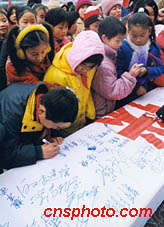 河南省會鄭州萬余名青少年和各界群眾聚集火車站廣場,舉行“崇尚科學、反對邪教”簽名活動,同時鄭州市青年志愿者反邪教宣傳隊宣告成立。中新社圖 慎重 攝