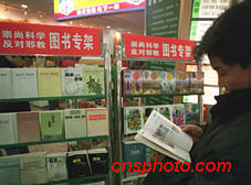 以“反對邪教、維護穩定、崇尚科學、傳播文明”為主題的“青年文明社區反邪教行動”近日在北京市全面啟動。北京圖書大廈特設“反邪教”圖書專柜,一位年青人認真翻閱宣傳圖書。中新社圖 陸云 攝