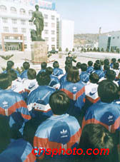 遼寧省撫順市二百多名正在轉化的法輪功練習者,在雷鋒的雕像前重聽雷鋒的故事,感受真正的真和善。中新社圖 爾東 攝