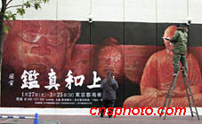 中國唐代高僧鑒真東渡日本,帶來大量中國先進文化,成為中日友好交流的象征。時隔一千多年,鑒真至今仍深受日本人民尊敬,東京美術館今春舉辦為期兩個月的“鑒真和尚展”。圖為兩名工作人員在東京鬧市區涉谷描繪巨幅展覽廣告畫。中新社圖 陶光雄 攝