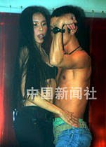 性感歌后莫文蔚19日晚在香港中環一家的士高內與歌迷聚會,并在臺上與舞蹈員大跳貼身舞,演繹《幻聽》一曲。中新社傳真 王順 攝