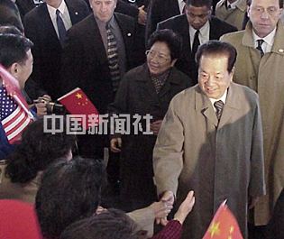 中國國務院副總理錢其琛三月二十一日乘機從紐約抵達華盛頓里根國家機場,受到近百名華盛頓華人華僑和留學生代表和中國駐美使館高級官員的熱烈歡迎.中新社圖 京華 攝