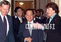 美東時間二十二日早晨,中國國務院副總理錢其琛在華盛頓國會山會見了美國國會議員。圖為參議員克雷格·托馬斯(左)、戴安娜·范斯坦(右)迎接錢副總理。中新社圖 胡啟華 攝