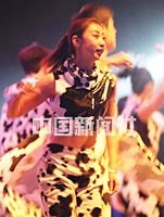 2000年中國歌曲排行榜頒獎晚會,二十三日晚在頒獎裝飾一新的首都體育館舉行,并評出中國十大金曲。 圖為晚會載歌載舞的熱鬧場面。 中新社記者 錢興強 攝