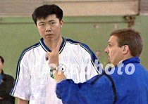 三月二十八日下午,美國芝加哥小牛隊助理教練小尼爾森,在北京先農壇體育場對中國男籃新秀王治郅進行了單獨訓練,大郅的出色表現讓小尼爾森驚訝不已。此舉是為大郅能盡快了解小牛隊的技戰術而特意安排的。中新社圖