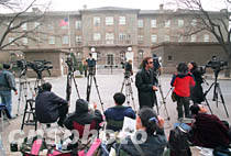 中美撞機事件引起中外新聞媒體的極大關注。四月六日,記者們在北京美國駐華大使館門前支起攝像機,安營扎寨。中新社記者 史利 攝
