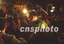 美國駐華使領館官員席樂高八日凌晨二時許在海口文華酒店出席海南省外事僑務辦公室舉行的新聞發布會后,面對中外記者包圍追問與機組人員第三次見面等情況,再也一言不發。中新社記者 賈國榮 攝