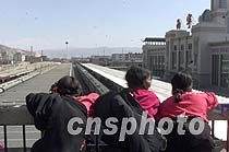 來自拉薩的藏族婦女在西寧火車站天橋上觀看即將出發的列車,盼望抵達拉薩的青藏鐵路早日建成。青海省西寧火車站是未來青藏鐵路的起點。中新社記者 毛建軍 攝
