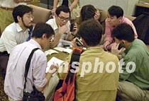 一批日本記者連日在海南省海口文華大酒店整天追蹤采訪美國軍用偵察機撞毀中國戰機事件,獲得報道信息后往往圍在圓桌邊共同分享。中新社記者 賈國榮 攝