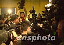 海南省政府外事辦公室主任陳辭十一日晚七時在海口文華大酒店舉行新聞發布會,宣布中國外長唐家璇接受了美國政府遞交的致歉信,引起記者包圍采訪。中新社記者 賈國榮 攝