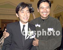 香港影視巨星周潤發(fā)4月11日在香港禮賓府出席表彰香港杰出電影工作者酒會(huì),并耐心等待獲表彰的梁朝偉接受完記者采訪后熱情向梁朝偉祝賀。中新社傳真任晨鳴攝