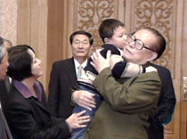 中國(guó)國(guó)家主席、中央軍委主席江澤民二十日在北京人民大會(huì)堂會(huì)見被美機(jī)撞毀戰(zhàn)機(jī)而犧牲的飛行員王偉的家屬時(shí),抱起王偉的兒子相互親吻。
