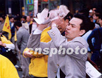四月二十一日,在紐約東百老匯街頭一位穿西服的華人男子,將“法輪功”癡迷者塞來的小冊子撕得粉碎。中新社圖 郭健 攝