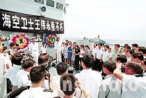 ![]() 阮國琴把花環拋進大海,祭奠自己的丈夫。中新社圖 張全躍 攝 ![]() 解放軍海軍領導,海南省政府、浙江湖州市政府官員和王偉的妻子阮國琴、姐姐王琳等乘海軍某部509艦參加了海上祭奠活動。中新社圖 張全躍 攝