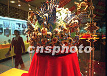 北京定陵出土的明代“六龍三鳳冠”29日在剛剛落成的明十三陵博物館展廳內展出。此次“神秘的帝王幽宮”歷史文物展展示了包括萬歷皇帝金絲翼善冠、嵌有大塊祖母綠寶石的大碌帶等四百余件稀世珍寶。中新社圖 鄭萍萍 攝