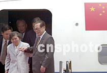 ![]() 中國國家主席江澤民5月8日中午乘專機抵達香港機場,參加“2001年《財富》全球論壇”,登車前向采訪的記者招手致意。中新社傳真任晨鳴攝