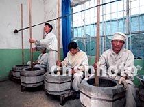圖:藏醫(yī)學(xué)院學(xué)員們親自研磨礦物質(zhì)藥材