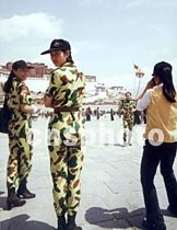 在西藏拉薩,追逐新潮的藏族女孩子,身穿迷彩服,到布達拉宮廣場留影。中新社圖 吳新華 攝
